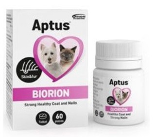 Aptus Biorion, doplňkové krmivo pro psy a kočky, určené k péči o srst a podpoře růstu srsti a drápů.