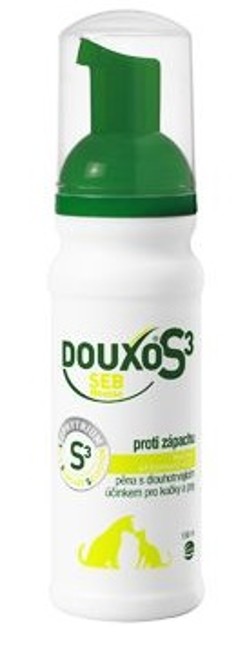 Pouze pro vnější použití. Před použitím přípravku srst důkladně vykartáčujte. Stříkněte si jednu nebo dvě dávky DOUXO S3 SEB pěny do dlaně a naneste pěnu přímo do suché srsti. Vetřete jemně proti směru růstu srsti, aby se pěna dostala až ke kůži. Opakujte, kolikrát je třeba tak, aby pěna pokryla celé tělo zvířete, vyhýbejte se přitom okolí očí a úst. Neoplachujte. Nechte uschnout na vzduchu. Po vysušení se může zvíře ještě vykartáčovat, aby se srst leskla. V případě potřeby očisty pokožky lze použít také DOUXO S3 SEB šampon. SLOŽENÍ: