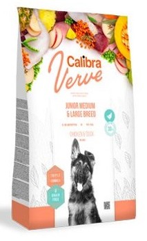 Calibra Dog Verve Junior Medium and Large Breed (Chicken & Duck) – kompletní suché krmivo s čerstvým masem bez obilovin pro mladé psy ve věku 3-30 měsíců středních a velkých plemen s hmotností nad 10 kg.