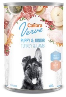 Calibra Dog Verve Puppy & Junior Turkey & Lamb je kompletní vlhké krmivo bez obilovin určené pro štěňata. Recepturu tvoří nevšední kombinace krůty a jehněčího s jablky, šípkem, brusinkami a rakytníkem.