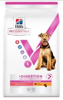 Hill's VET ESSENTIALS MULTI-BENEFIT DIGESTION krmivo s kuřetem pro dospělé psy středních plemen je kompletní, všestranně prospěšné krmivo pro dospělé psy starší 1 roku. Poskytuje přesné nutričně vyvážené množství energie, bílkovin, vitaminů a minerálů a jedinečnou směs prebiotik.