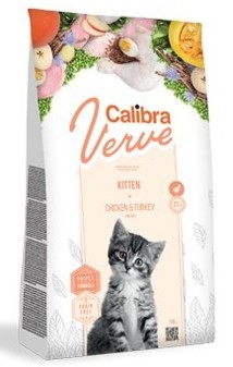 Calibra Cat Verve Kitten Chicken & Turkey je kompletní krmivo s vysokým obsahem čerstvého masa bez obilovin – s kuřetem a krůtou. Receptura je určená pro koťátka. Čerstvé maso z kuřete tvoří 27 % celkového obsahu. Proteiny v receptuře jsou z 87,8 % živočišného původu.