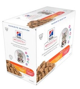 Hills VET ESSENTIALS krmivo pro dospělé kočky s lahodným dušeným kuřetem a lososem poskytuje pokrokovou výživu s 5 základními zdravotními přínosy pro vaši kočku.