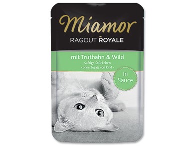 Kapsička s masem z krocana a zvěřinou.ve šťávěmaso a živočišné produkty (10% maso z krocana, 10% zvěřina), vedlejší produkty rostlinného původu, minerální látky.Jakostní znaky: hrubé proteiny 8%, vlhkost 82%, hrubé oleje a tuky 4,5%, hrubé popeloviny 2%, hrubá vláknina 0,4%, vitamin D3 200 m.j./ kg, vitamin E (alfatokoferol) 100 mg / kg, taurin 100 mg / kg, měď (jako síran měďnatý, pentahydrát) 2 mg / kg, mangan (jako síran manganatý, monohydrát) 1,5 mg / kg, zinek (jako síran zinečnatý, monohydrát) 5 mg / kg, jód (jako jodid draselný) 0,5 mg / kg.