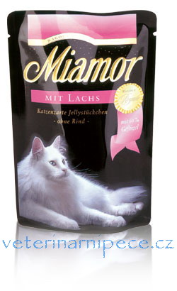 Kapsička s masem z lososa v delikátním rosoluryby a vedlejší výrobky z ryb (10% maso z lososa), minerální látky.Jakostní znaky: hrubé proteiny 8%, vlhkost 82%, hrubé oleje a tuky 5%, hrubé popeloviny 2,5%, hrubá vláknina 0,5%, vitamín D3 250 m.j./ kg, vitamín E (alfatokoferol) 15 mg / kg, měď (síran měďnatý pentahydrát) 1 mg / kg, mangan (síran manganatý monohydrát) 1 mg / kg, zinek (síran zinečnatý monohydrát) 16 mg / kg.