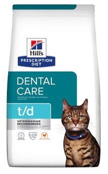 Hills™ Prescription Diet™ Feline t/d™ : kontrola dentálního plaku, zbarvení, zubního kamene, zápachu z dutiny ústní a gingivitis u dospělých koček. Onemocnění z nedostatku vlákniny.
