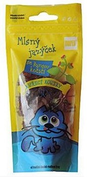 Kuřecí kousky se šantou kočičí – je krájené čerstvé kuřecí maso, sušené teplým, čistým vzduchem. Do každého sáčku je přidána snítka šanty kočičí, pěstované ve Velharticích na Šumavě, sušené přírodním způsobem.
