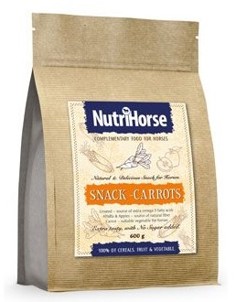 Pamlsky pro koně v papírovém zpětně uzavíratelném sáčku.