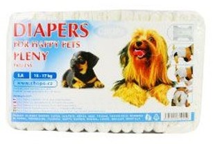 Jednorázová absorbční plena pro psy je vhodná na cesty, ale i v domácnosti. Ideální pro vaše štěňata, háravé feny, nemocné psy atp. Plenky jsou pohodlné a nijak nebrání v pohybu. Ocasní díra je navržena tak, aby nijak neomezovala vašeho psa. Jemná a měkká povrchová vrstva z netkaného textilu odvádí rychle vlhkost. Mimořádně savý materiál vstřebává rychle tekutinu a vnější folie spolehlivě chrání před prosáknutím. Upínací proužky jsou inovační a jedinečné, dají se snadno upevnit. Plena má dobře držící opakovaně použitelné upínací pásky které jsou upravovány tak, aby se nezachytávala srst zvířete k lepící části upínacího pásku. Plenky jsou výbornou ochranou před nežádoucím unikem moči jak doma na vaší podlaze či pohovce tak při cestování autem nebo letadlem, příp. i venku na vaší zahradě, kde nechcete, aby váš pes značkoval a zbyla po něm vypálená místa na vašem trávníku. Váš pes si musí na plenku zvykat jako štěně na obojek nebo náhubek. Pří výběru je velmi důležité zvolit správnou velikost plen (nejste-li si jisti, pak raději větší). Jsou vyráběny v 6 velikostech a jsou rozděleny podle hmotnosti psů.