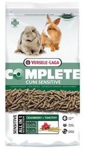 Kompletní krmivo pro zakrslé králíky. Cuni Sensitive Complete je 100% extrudované jednosložkové krmivo se sníženým obsahem energie, určené pro citlivé, méně aktivní nebo starší králíky. Je obohaceno o prebiotika, antioxidanty a brusinky. Usnadňuje tak trávení a podporuje správnou funkci močového ústrojí. Obsahuje vlákninu z celých neporušených kousků bojínkového sena. Bohatě doplněno o různé druhy trav a bylin. Neobsahuje obiloviny.